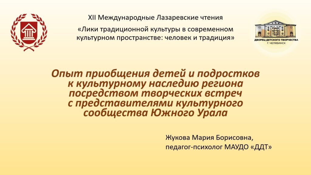 На одной из секций конференции Жукова Мария Борисовна, педагог-психолог Дворца детского творчества, представила собравшимся содержание и результаты реализации проекта «От сердца к сердцу», выступив с докладом: «Опыт приобщения детей и подростков к культурному наследию региона посредством творческих встреч с представителями культурного сообщества Южного Урала».
